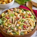 This Chicken Caesar Pasta Salad combines the classic flavors of Caesar dressing with hearty penne pasta, grilled chicken, fresh romaine lettuce, and crunchy croutons. Perfect for a light lunch or a flavorful side dish, this salad is tossed with a creamy anchovy-based dressing and finished with parmesan cheese and fresh parsley.