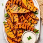 - Serve: Arrange grilled sweet potato wedges on a serving platter, garnish with fresh parsley if desired, and serve with the garlic aioli dipping sauce.