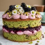 This Pistachio and Blackberry Olive Oil Cake is a moist and flavorful dessert featuring ground pistachios and a delicate olive oil base. Enhanced with almond and vanilla extracts, the cake is layered with a salted blackberry and thyme buttercream and finished with fresh blackberries and chopped pistachios for a stunning presentation. Perfect for a special occasion or an elegant treat, it combines nutty, fruity, and herbal flavors in a beautiful green-hued cake.