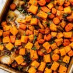 - Prepare Vegetables: Add the chopped sweet potatoes, sliced carrots (or parsnips), and red onion wedges into the bowl. Toss thoroughly to coat all the vegetables with the oil and herb mixture. Sprinkle with sea salt and ground black pepper and toss again to distribute the seasoning evenly.