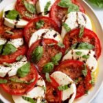 - Assemble the Salad: On a rimmed serving platter, layer the tomato slices, fresh mozzarella slices, and fresh basil leaves in an alternating pattern.